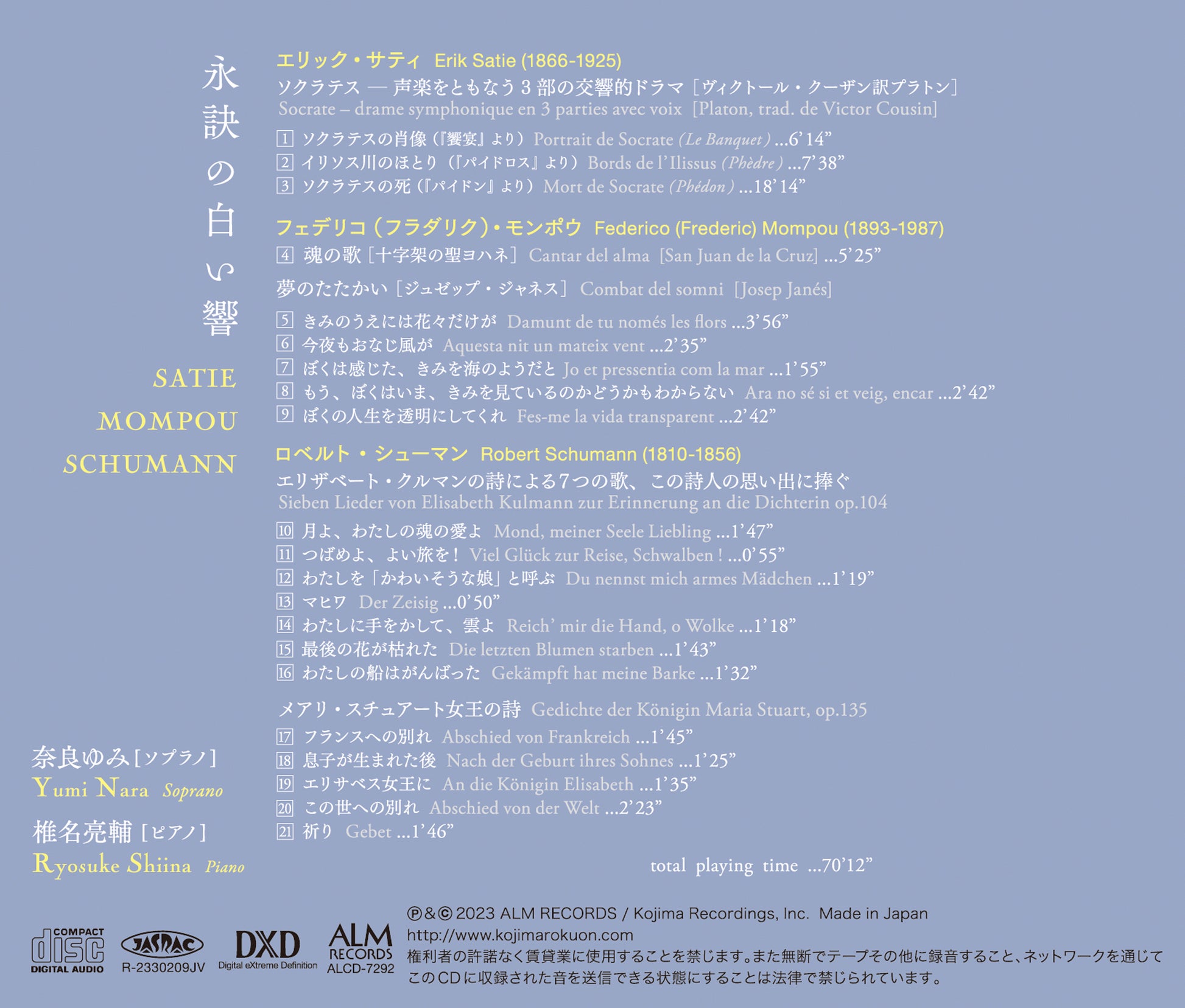 フランス歌曲や現代音楽などで幅広い音楽性に定評のあるソプラノ・奈良ゆみと、音楽美学・音楽哲学の分野で活躍する椎名亮輔のピアノによる、サティ、シューマンの最晩年の作、および生涯にわたって書き継がれたモンポウの作品。いずれの曲も容赦なく迫りくる「死」についての予感に満ちており、歴史的・様式的には関連がまったくないはずの3人の作曲家の作品に、奇妙な共通点を数多く見出すことも可能であろう。