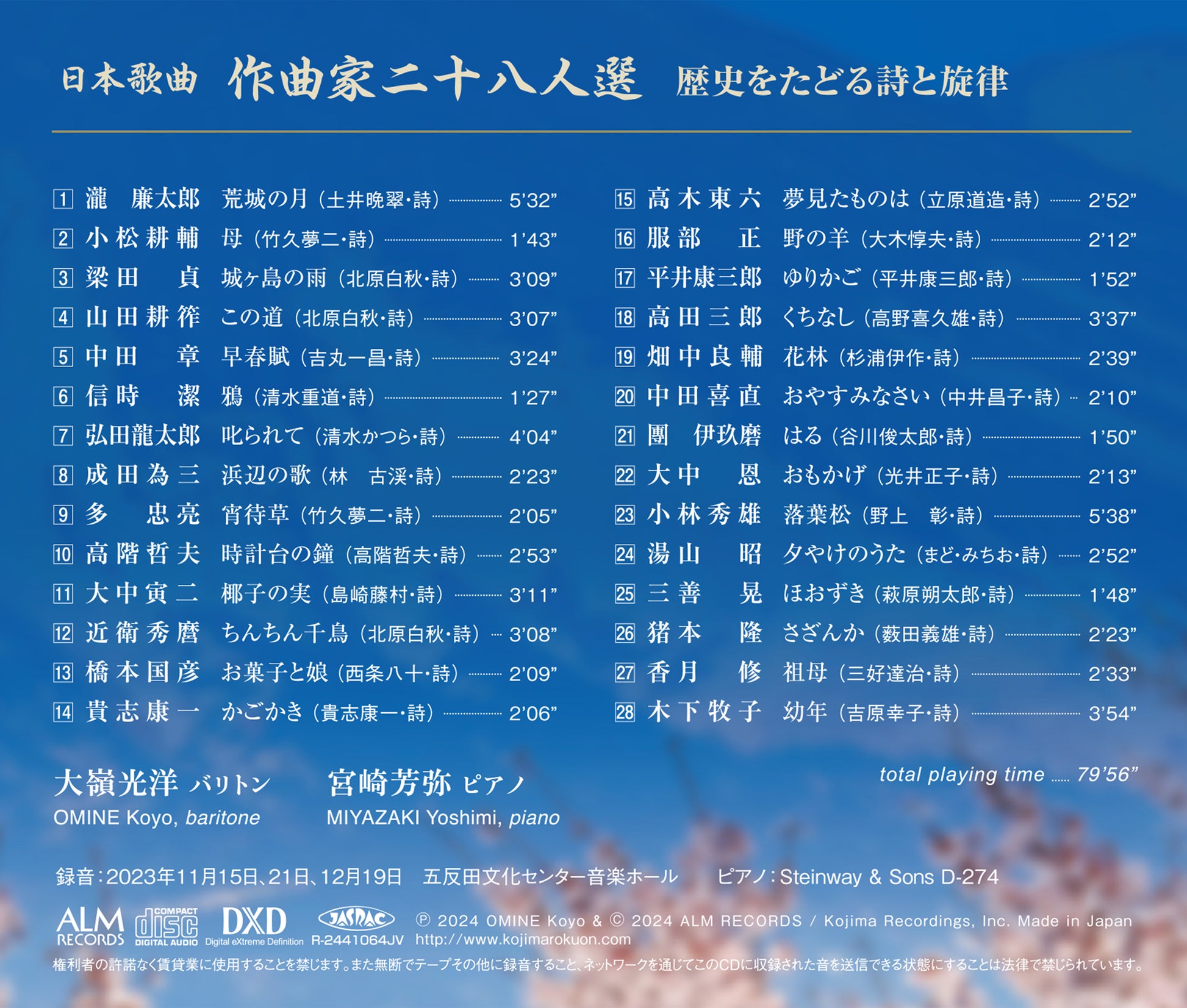 80歳から日本歌曲のCDを発表し始め、好評を博している大嶺光洋の3枚目となるアルバム。今作では作曲年が古いものから新しいものまで約110年にわたる28人の作曲家による28作品が取り上げられており、まさに日本歌曲の歴史を俯瞰する1枚。