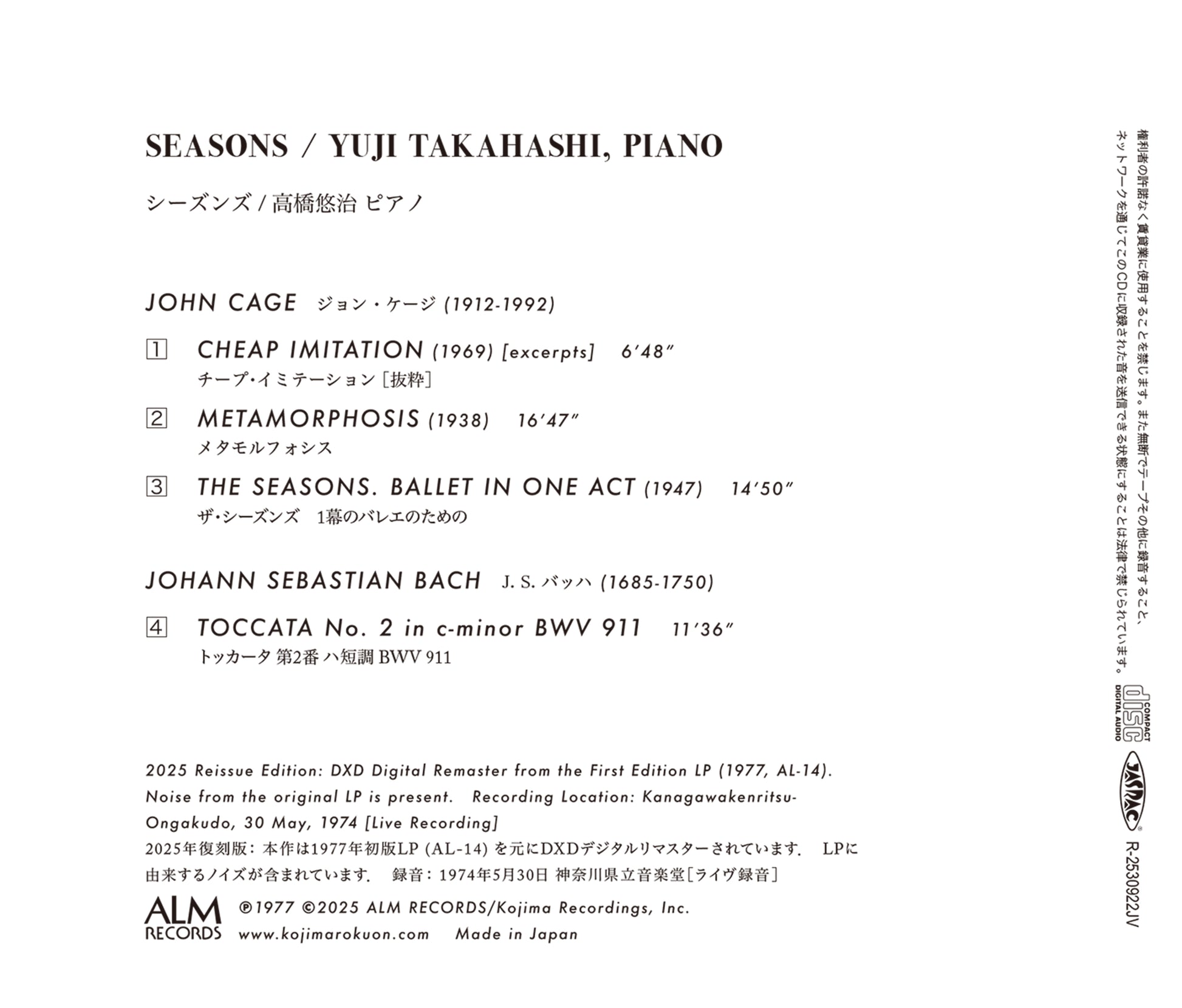 Recording: Kanagawakenritsu-Ongakudo, May 30. 1974 (YUJI TAKAHASHI plays J.S.BACH & J.CAGE, Live Recording)