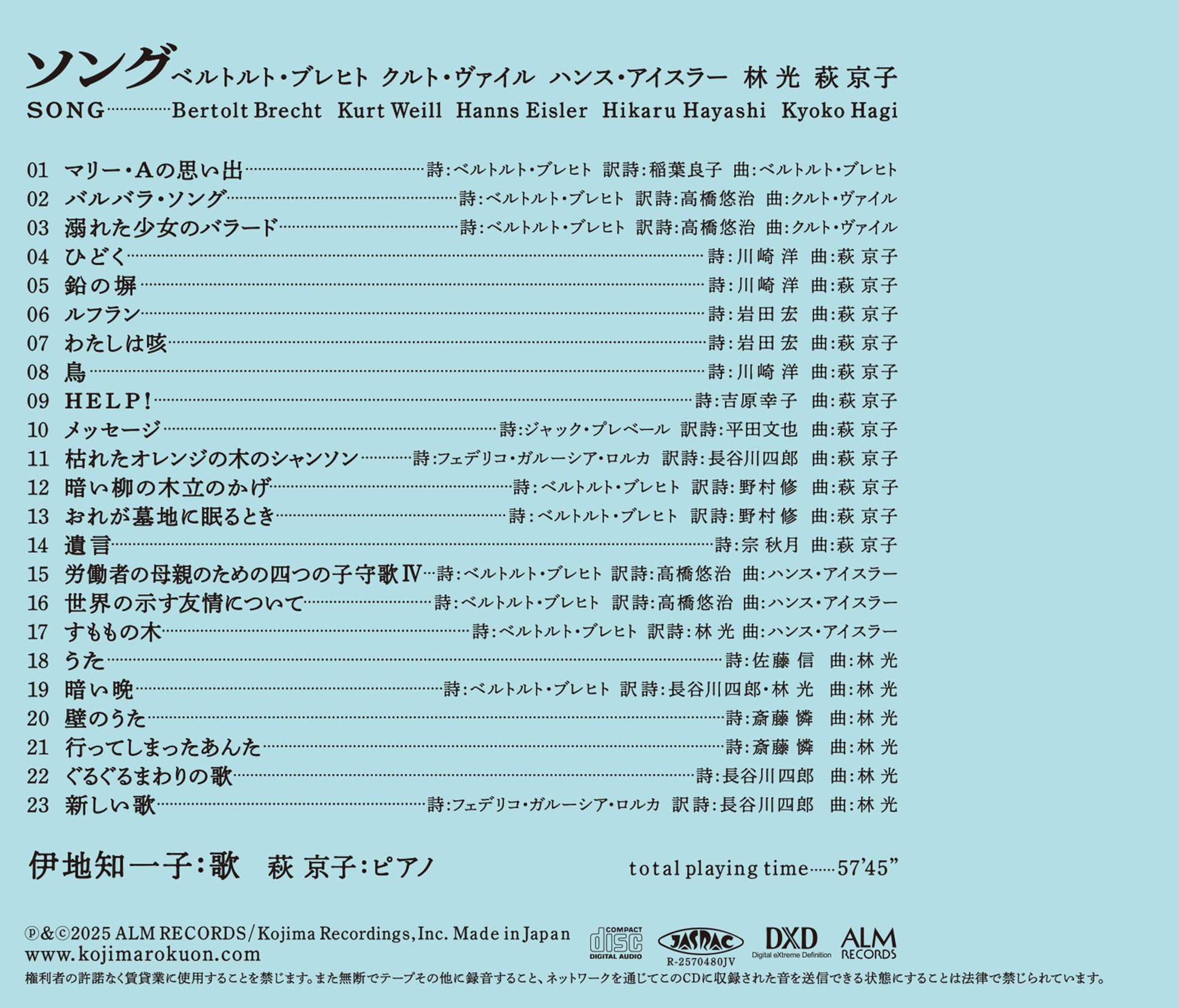 SONG –Bertolt Brecht, Kurt Weill, Hanns Eisler, Hikaru Hayashi, Kyoko Hagi–
