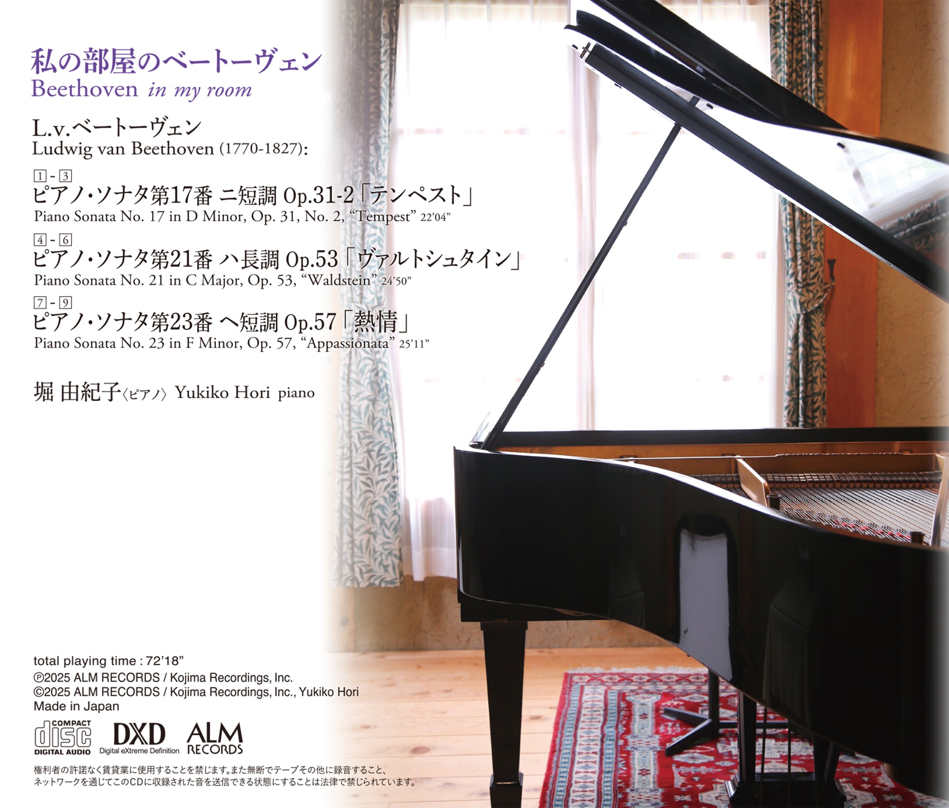 Yukiko Hori’s rigorous musical architecture, grounded in her fresh and lucid view of each work, brings vividly to life the will to construct, and the delicate balance between stillness and surging force, reflected in three sonatas representative of Beethoven’s middle period. This album offers the closest possible encounter with the intimate yet clear-edged sound that fills the clay-walled space created in the pianist’s own home.