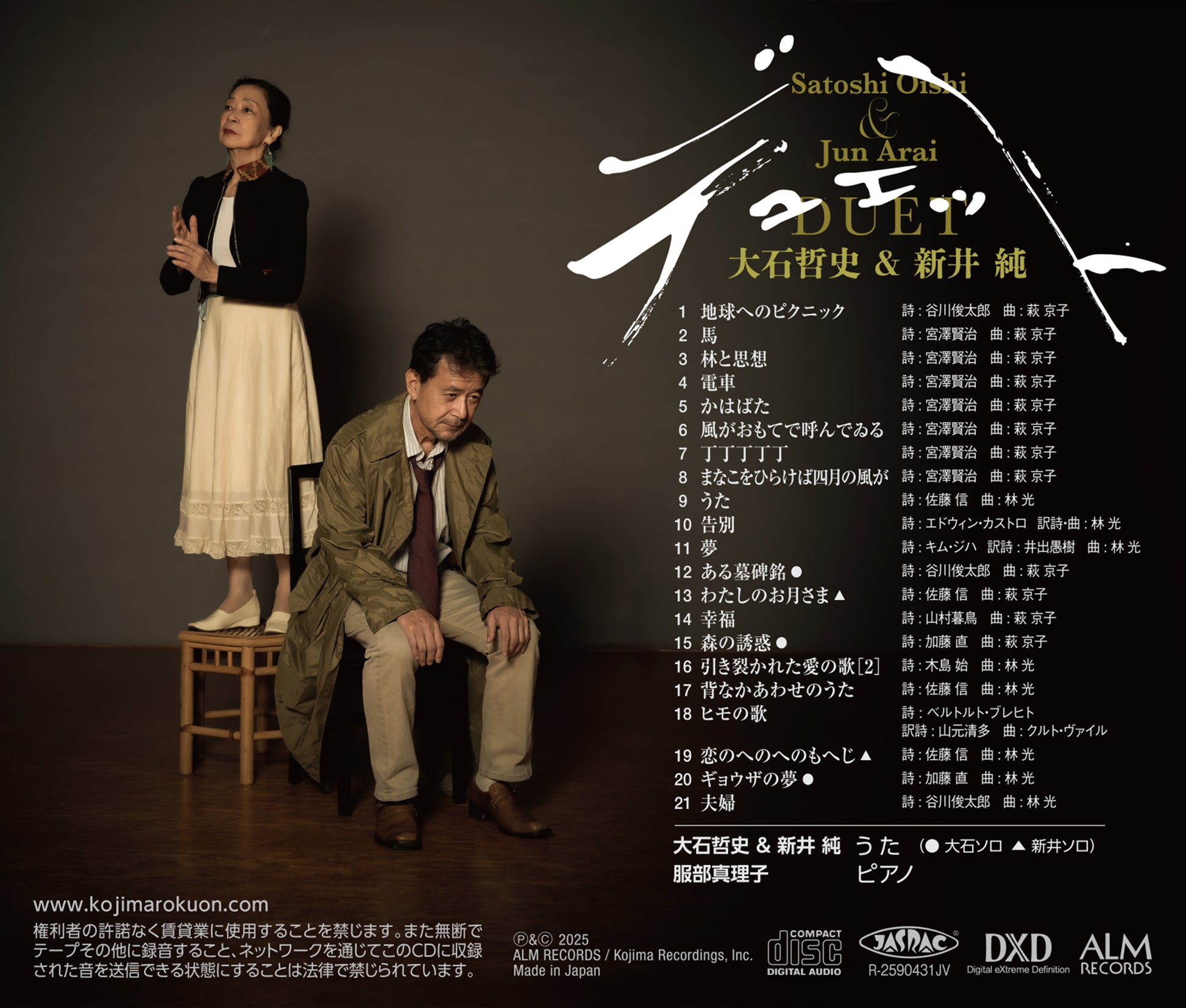 オペラシアターこんにゃく座で活躍する大石哲史と舞台女優・新井純によるデュエット集。自由奔放なソロと、相手の呼吸を自然にとらえて寄り添うデュエット。その両面を自在に行き来する大石哲史。一方、澄んだ声で少女から男役まで自在に演じ分け、近年ますます歌に深みを増した新井純。そんな彼女と大石哲史の声が重なることで、二重唱の魅力はさらに広がる。服部真理子の雄弁なピアノに導かれ、異なる個性を持つ二人が織りなす「デュエット」の醍醐味を存分に味わえる一枚。
