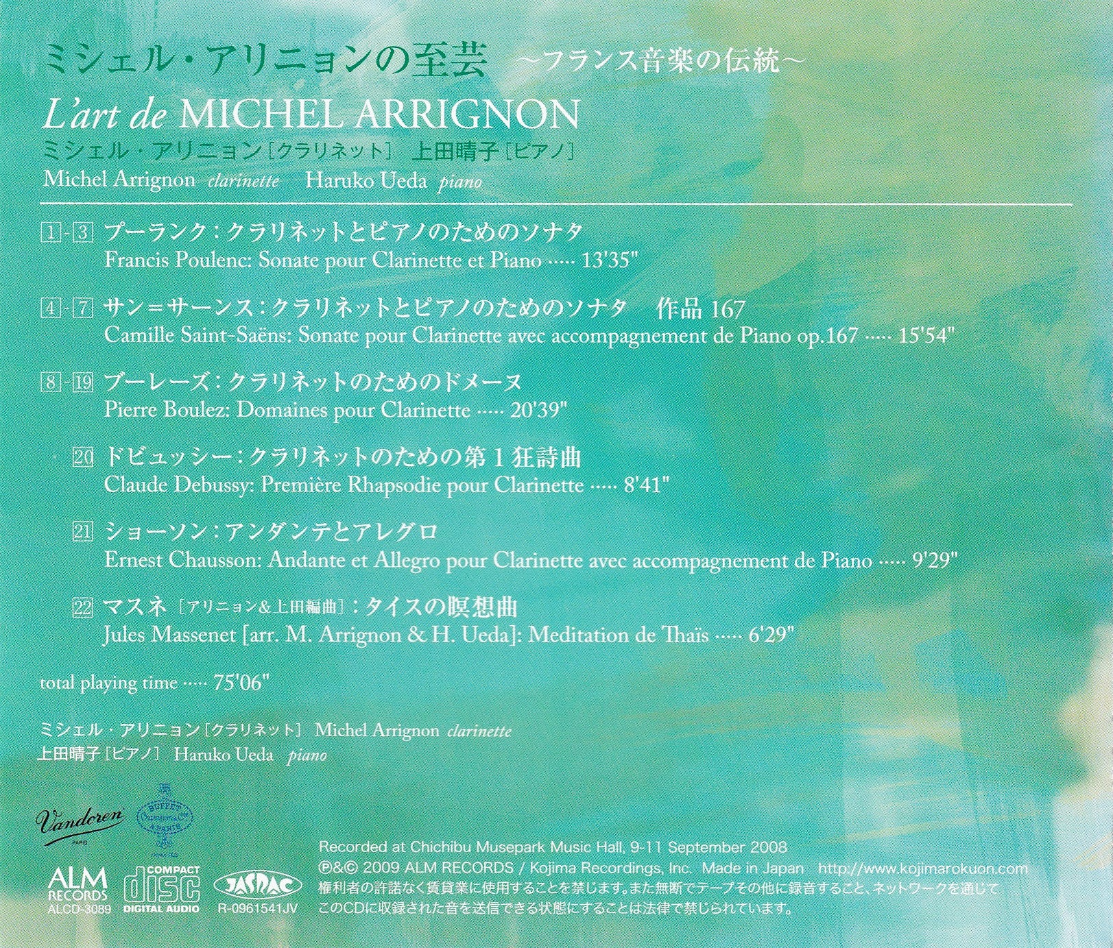 ともにパリ国立高等音楽院で教鞭をとるアリニョンと上田晴子のデュオは、まさに圧巻。多彩な音色と軽快なリズム感でアリニョンが自在に吹けば、上田のピアノがそれに共鳴し絶妙な絡みを見せる。特殊奏法が駆使され、名手アリニョンのあらゆるテクニックが堪能できるブーレーズ《ドメーヌ》も聴きごたえたっぷり。最後に収録された《タイスの瞑想曲》は、さながらフルコースの後の絶品スイーツのようである。